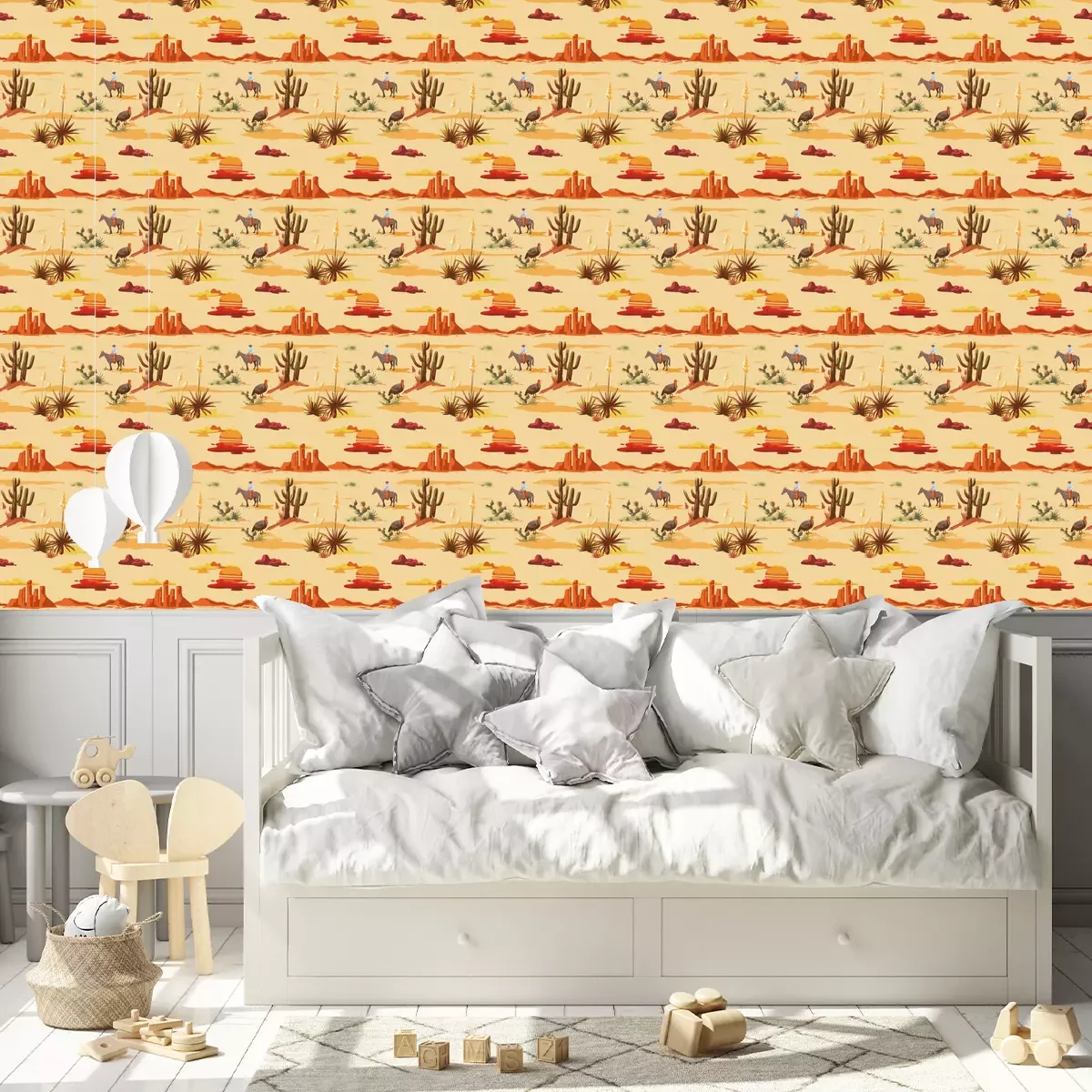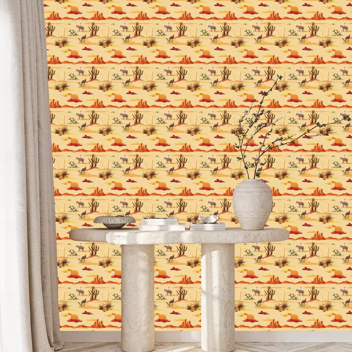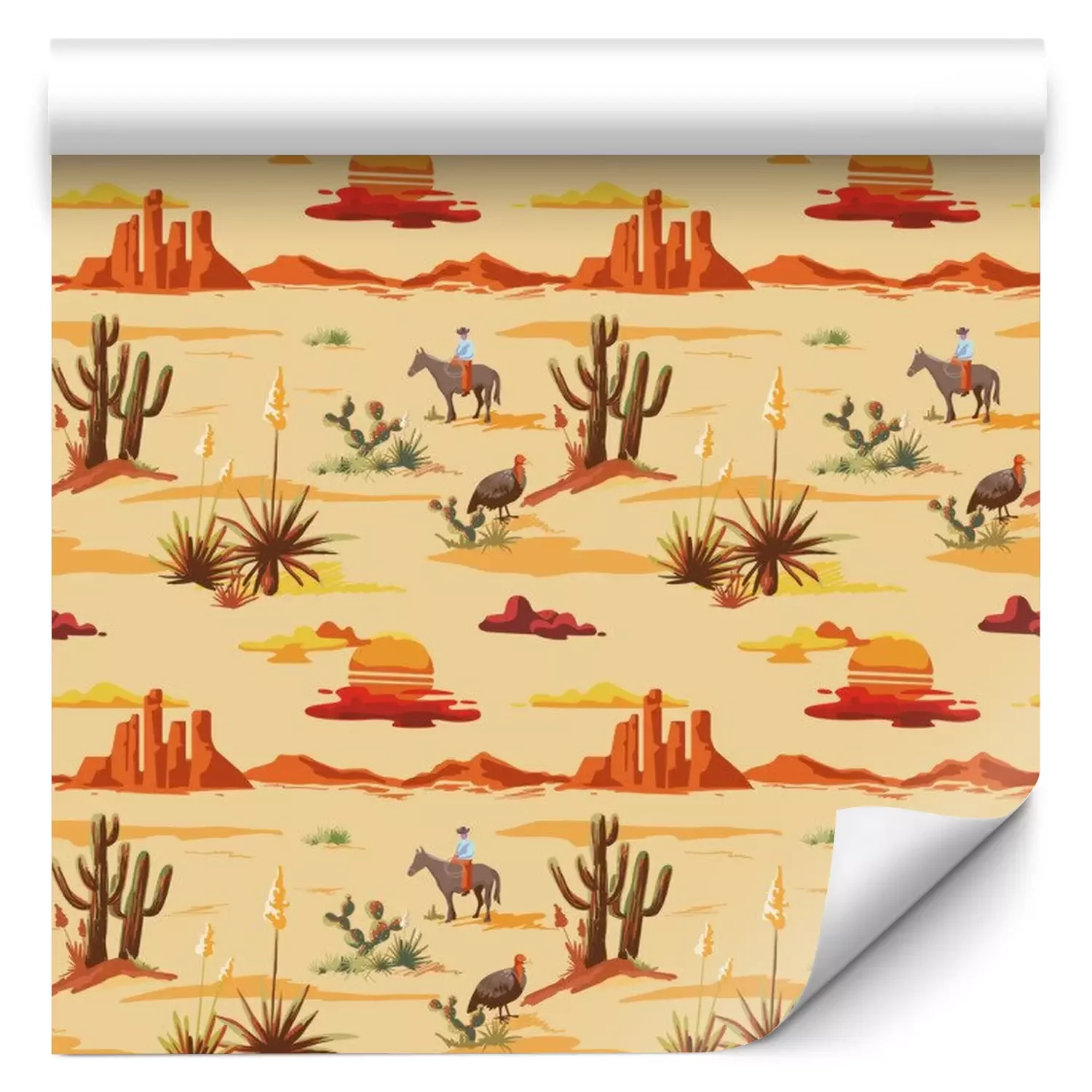 Tapete Vintage beautiful seamless desert illustration pattern. Landscape with cactus, mountains, cowboy on horse, sunset vector hand drawn style background