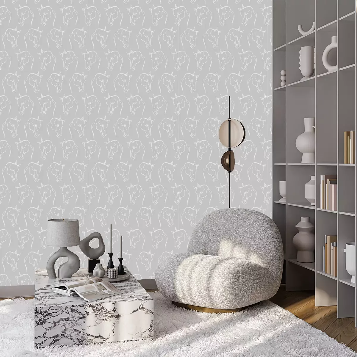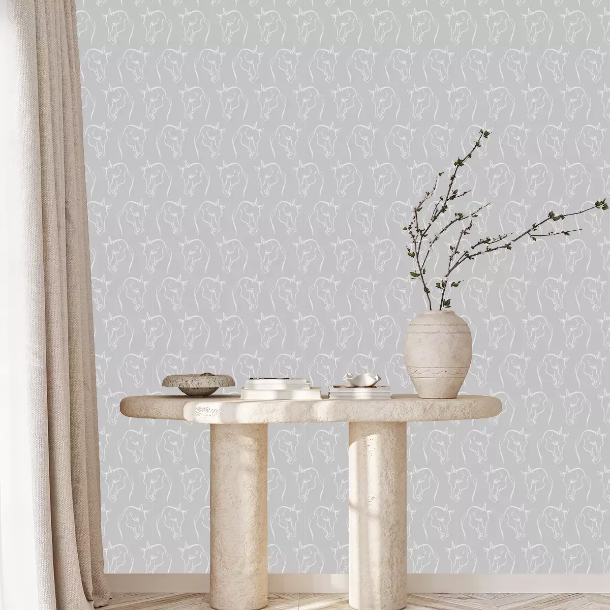 Die Tapete mit Pferden, die Pferdeköpfe auf grauem Hintergrund zeigt, wirkt elegant und zeitlos und eignet sich hervorragend für verschiedene Innenräume. Ihr minimalistisches Muster, das aus Reihen von Pferdekopf-Umrissen besteht, bildet eine harmonische Komposition. Eine solche Pferde Tapete passt gut zu modernen und klassischen Innenräumen und verleiht ihnen einen besonderen Charme und Charakter. Die hellgraue Farbe macht sie subtil und leicht an verschiedene Dekorationsstile anpassbar. Pferde in minimalistischen und skandinavischen Innenräumen können ein interessanter Mittelpunkt sein, der dem Raum einen aufregenden Akzent verleiht und ihn belebt. Sie passen auch gut zu traditionellen oder rustikalen Innenräumen. Pferdetapeten bringen ein subtil-natürliches Thema ins Interieur und verleihen dem Raum Wärme und Gemütlichkeit. Diese Wanddekoration kann mit verschiedenen Dekorationsstilen kombiniert werden. In Kombination mit dem modernen skandinavischen Stil kann sie mit schlichten Möbeln mit minimalistischem Design, natürlichen Materialien und neutralen Farben zusammengestellt werden, um eine ruhige Atmosphäre zu schaffen. Im klassischen Stil kann die Pferdetapete mit eleganten Möbeln mit abgerundeten Formen, zarten Stoffen und dezent verzierten Accessoires kombiniert werden, um dem Raum Eleganz und Raffinesse zu verleihen. Die Pferde Tapete kann auch mit Accessoires mit Reitsportmotiven kombiniert werden. Ein stilisierter Sattel oder Fotos von Pferden können daneben platziert werden, um das thematische und konsistente Ambiente zu verstärken. Es ist wichtig, Gleichgewicht und Mäßigung bei der Verwendung von Accessoires zu bewahren, um eine Überladung zu vermeiden, die die ruhige Ästhetik der Pferde stören könnte. Diese Tapete Pferde lässt sich sowohl in das Schlafzimmer eines Reitsportliebhabers als auch in ein elegantes, klassisches Wohnzimmer, ein Esszimmer oder ein Home-Office integrieren.