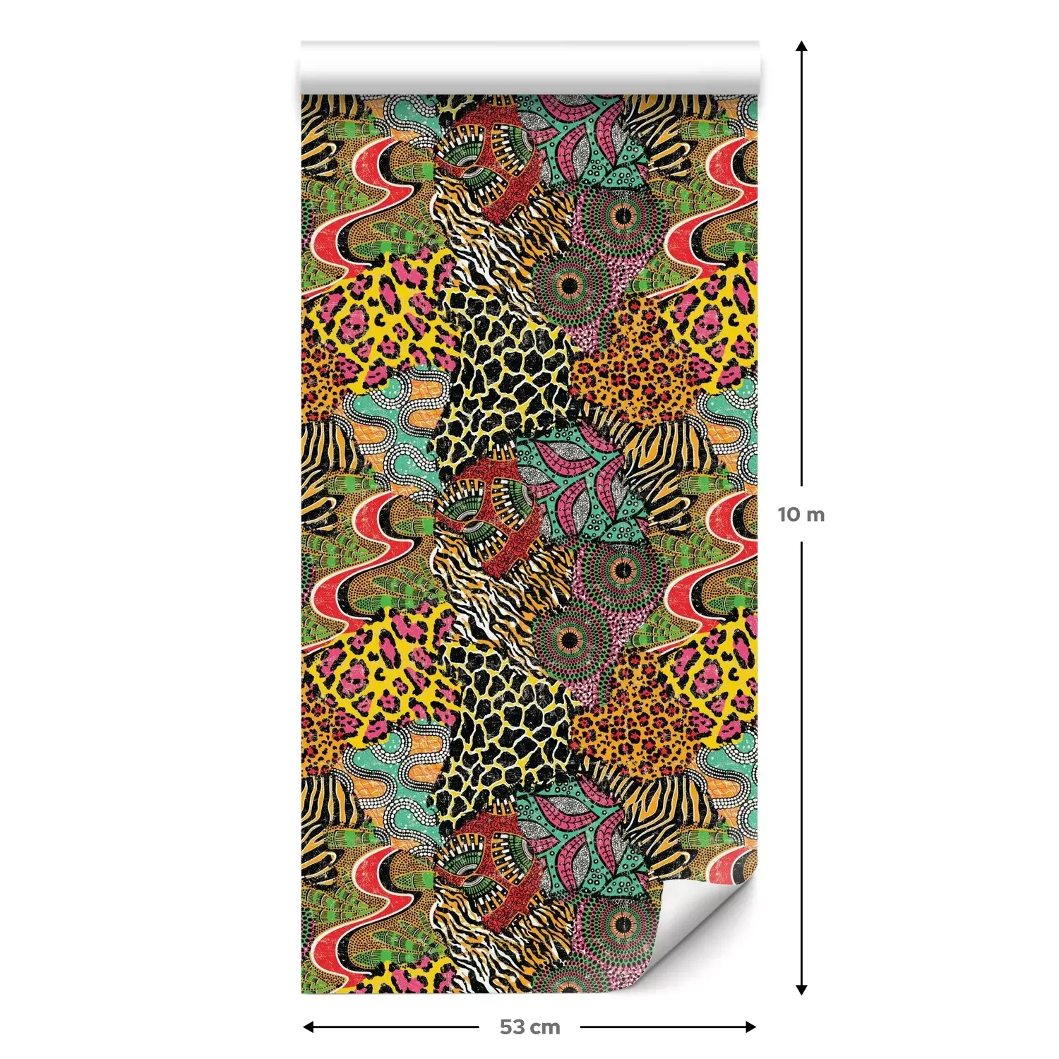 Eine Standard-Tapetenrolle hat die Maße 0,53 m x 10 m und deckt eine Wandfläche von etwa 5 m² ab.