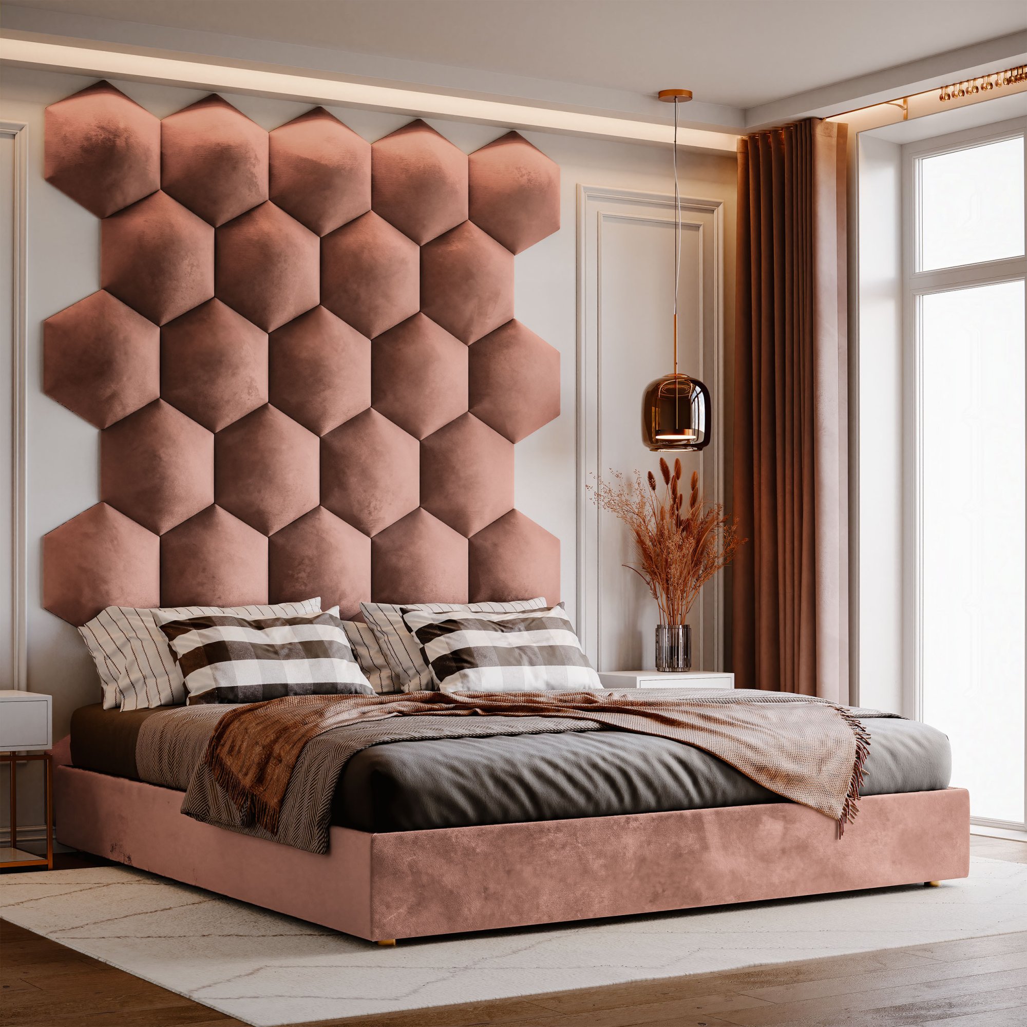 Unser Angebot umfasst Polsterpaneele in verschiedenen Formen, darunter quadratisch, rechteckig, sechseckig (hexagonal) und oval, die in vielen Größen und Farben erhältlich sind. Jedes Wandpolster besteht aus drei Schichten: einer robusten Spanplatte, einem hypoallergenen Polsterschaumstoff und einem Velours-Polsterstoff. Der Stoff ist fusselarm, abriebfest und nimmt keine Flüssigkeiten auf. All dies macht ihn pflegeleicht. Polsterpaneele lassen sich mit selbstklebenden Klettbändern ganz einfach befestigen. So gestalten Sie im Handumdrehen ein auffälliges Kopfteil im Schlafzimmer, eine gemütliche Spielecke im Kinderzimmer oder eine stilvolle Polsterwand im Wohnzimmer.
