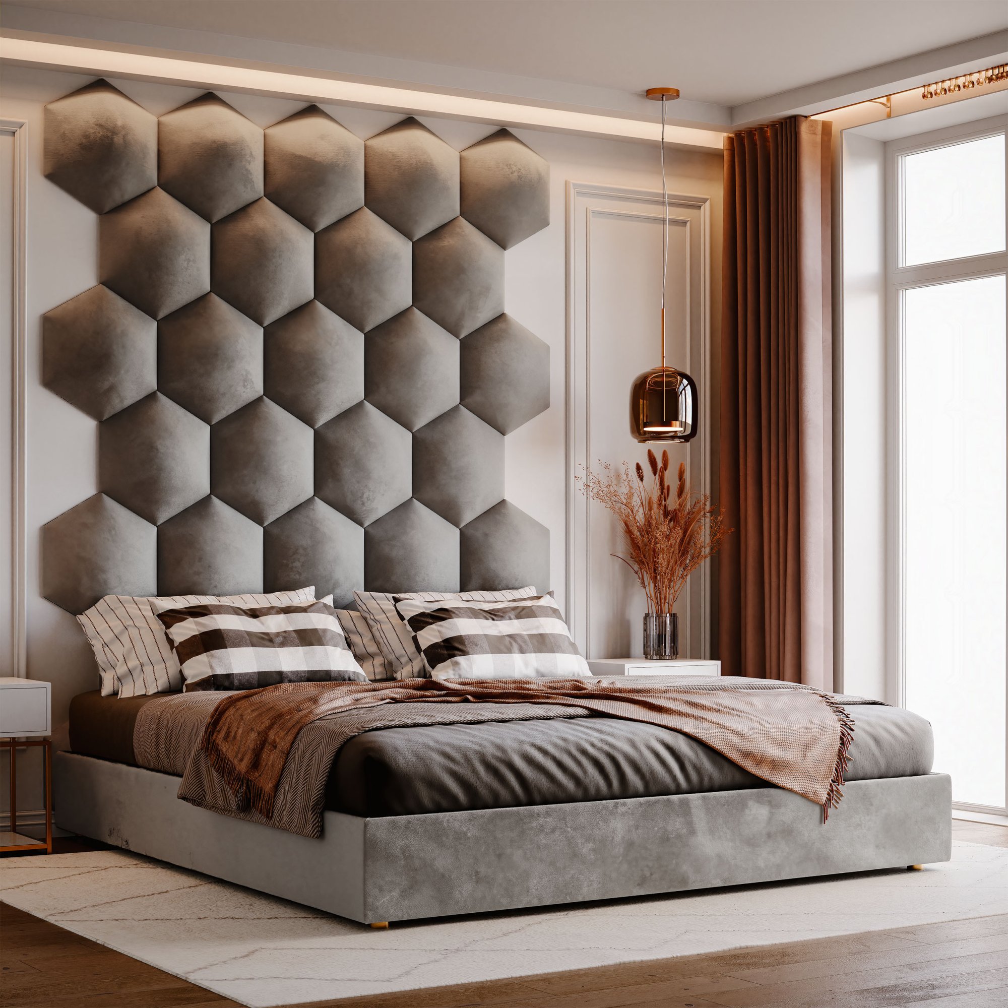 Unser Angebot umfasst Polsterpaneele in verschiedenen Formen, darunter quadratisch, rechteckig, sechseckig (hexagonal) und oval, die in vielen Größen und Farben erhältlich sind. Jedes Wandpolster besteht aus drei Schichten: einer robusten Spanplatte, einem hypoallergenen Polsterschaumstoff und einem Velours-Polsterstoff. Der Stoff ist fusselarm, abriebfest und nimmt keine Flüssigkeiten auf. All dies macht ihn pflegeleicht. Polsterpaneele lassen sich mit selbstklebenden Klettbändern ganz einfach befestigen. So gestalten Sie im Handumdrehen ein auffälliges Kopfteil im Schlafzimmer, eine gemütliche Spielecke im Kinderzimmer oder eine stilvolle Polsterwand im Wohnzimmer.