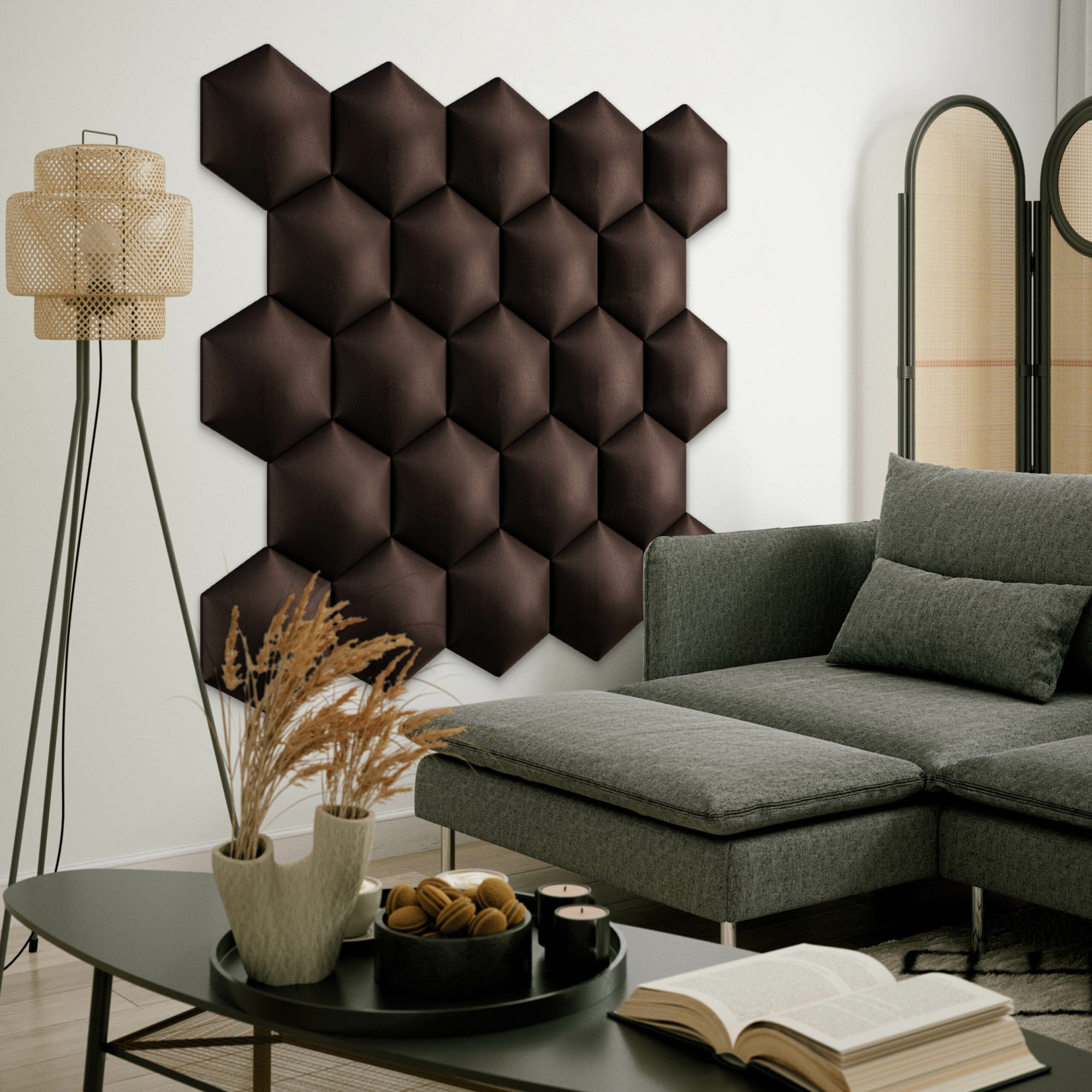 Unser Angebot umfasst Polsterpaneele in verschiedenen Formen, darunter quadratisch, rechteckig, sechseckig (hexagonal) und oval, die in vielen Größen und Farben erhältlich sind. Jedes Wandpolster besteht aus drei Schichten: einer robusten Spanplatte, einem hypoallergenen Polsterschaumstoff und einem Velours-Polsterstoff. Der Stoff ist fusselarm, abriebfest und nimmt keine Flüssigkeiten auf. All dies macht ihn pflegeleicht. Polsterpaneele lassen sich mit selbstklebenden Klettbändern ganz einfach befestigen. So gestalten Sie im Handumdrehen ein auffälliges Kopfteil im Schlafzimmer, eine gemütliche Spielecke im Kinderzimmer oder eine stilvolle Polsterwand im Wohnzimmer.