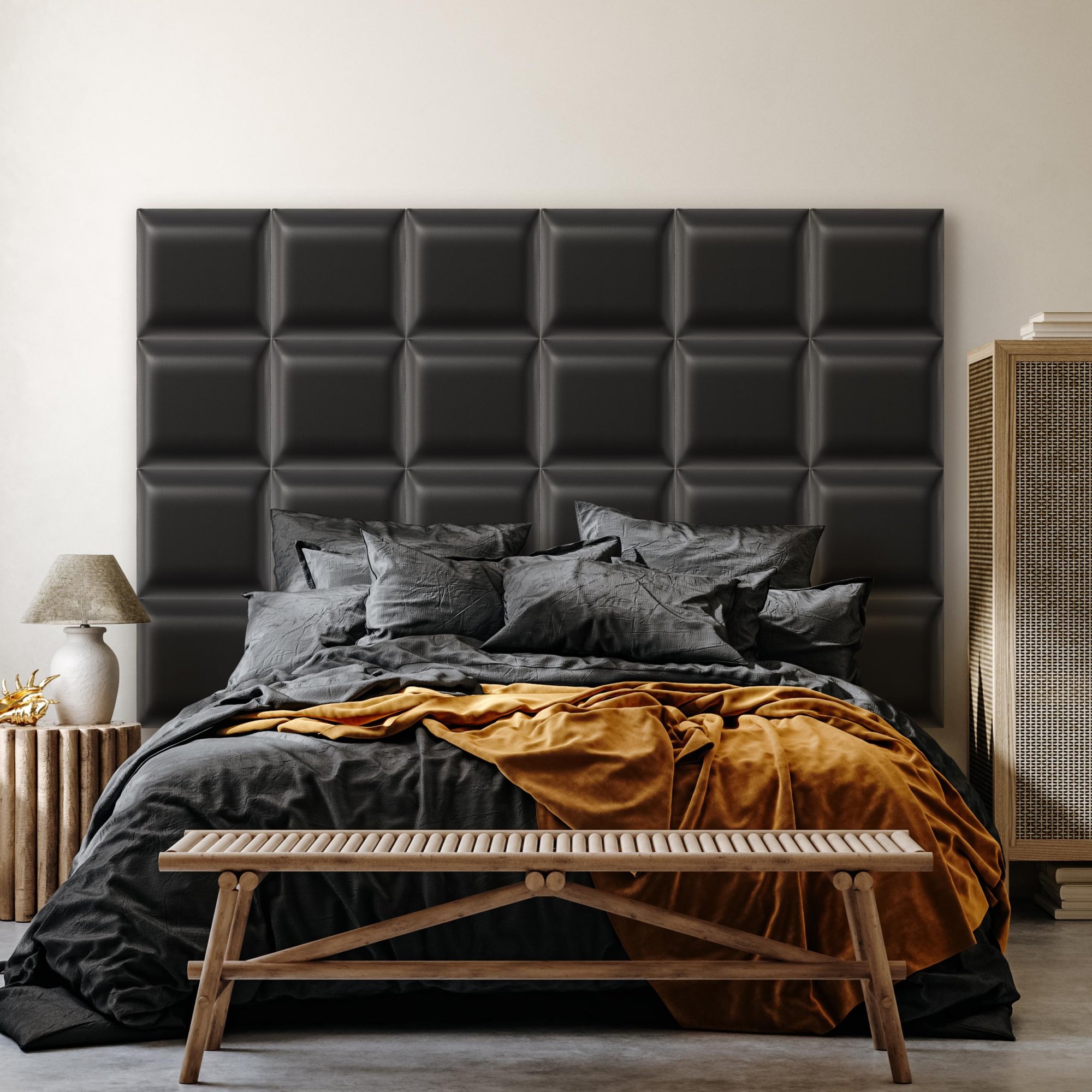 Unser Angebot umfasst Polsterpaneele in verschiedenen Formen, darunter quadratisch, rechteckig, sechseckig (hexagonal) und oval, die in vielen Größen und Farben erhältlich sind. Jedes Wandpolster besteht aus drei Schichten: einer robusten Spanplatte, einem hypoallergenen Polsterschaumstoff und einem Velours-Polsterstoff. Der Stoff ist fusselarm, abriebfest und nimmt keine Flüssigkeiten auf. All dies macht ihn pflegeleicht. Polsterpaneele lassen sich mit selbstklebenden Klettbändern ganz einfach befestigen. So gestalten Sie im Handumdrehen ein auffälliges Kopfteil im Schlafzimmer, eine gemütliche Spielecke im Kinderzimmer oder eine stilvolle Polsterwand im Wohnzimmer.